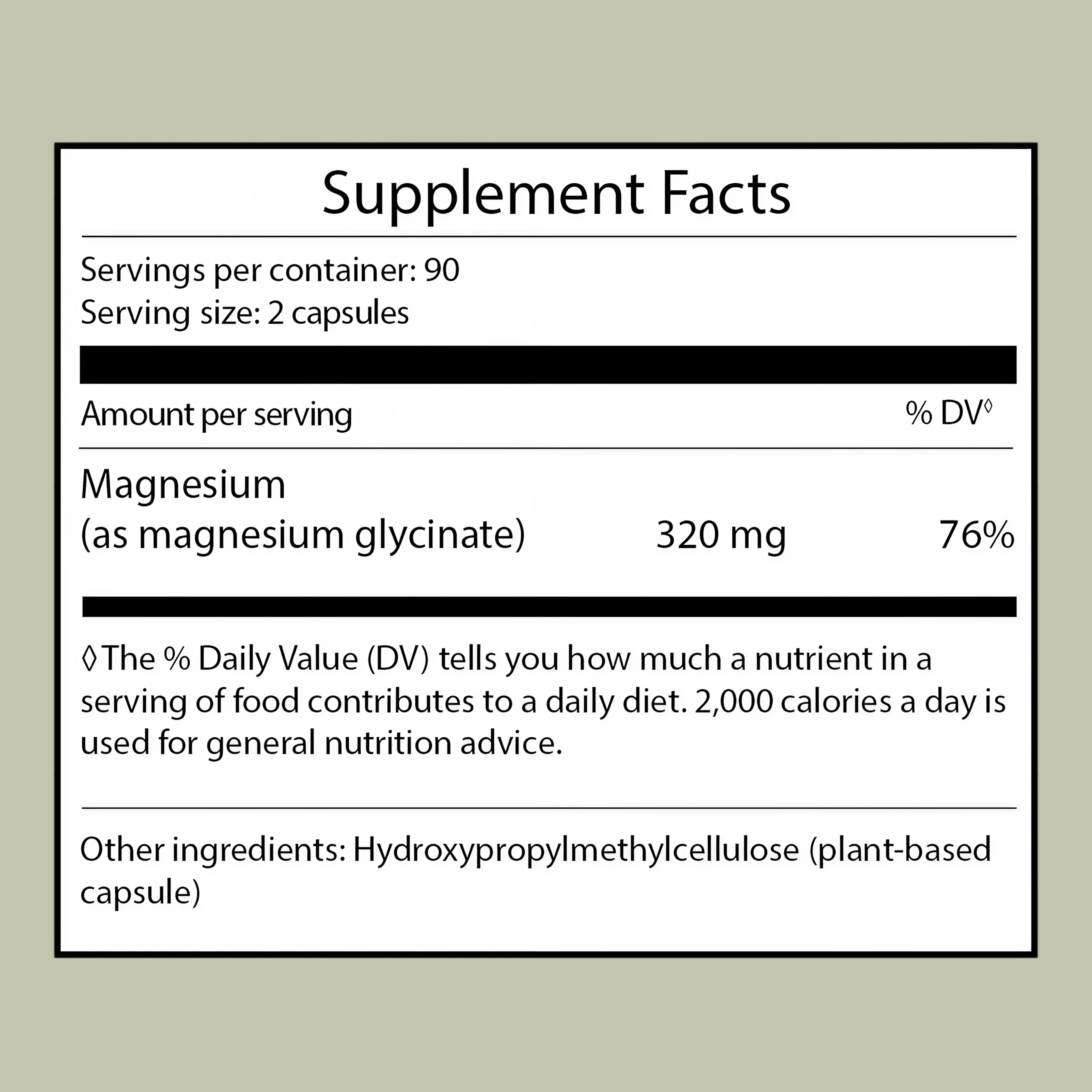 | Magnesium (as magnesium glycinate) | 320 mg | 76% |