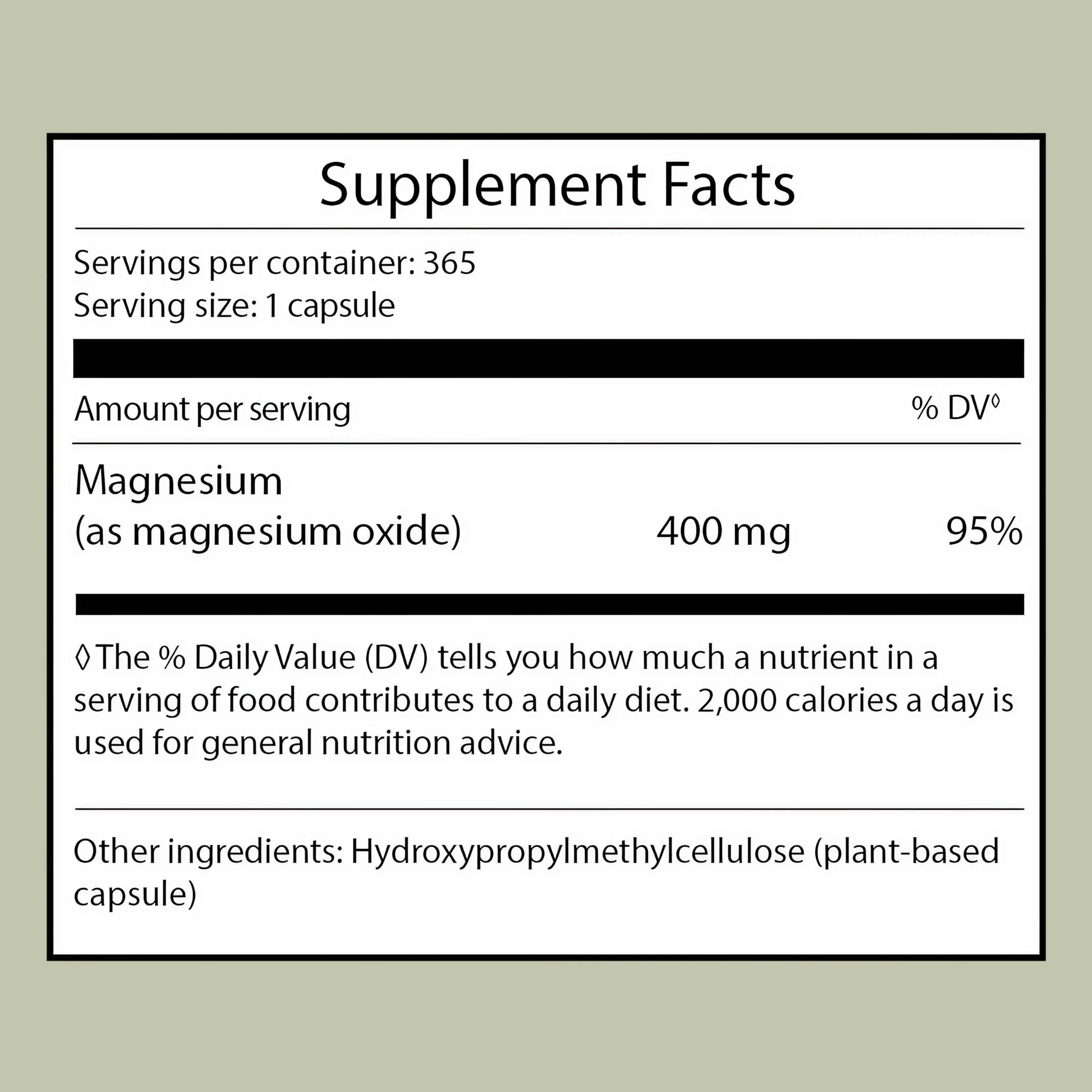 | Magnesium (as magnesium oxide) | 400 mg | 95% |