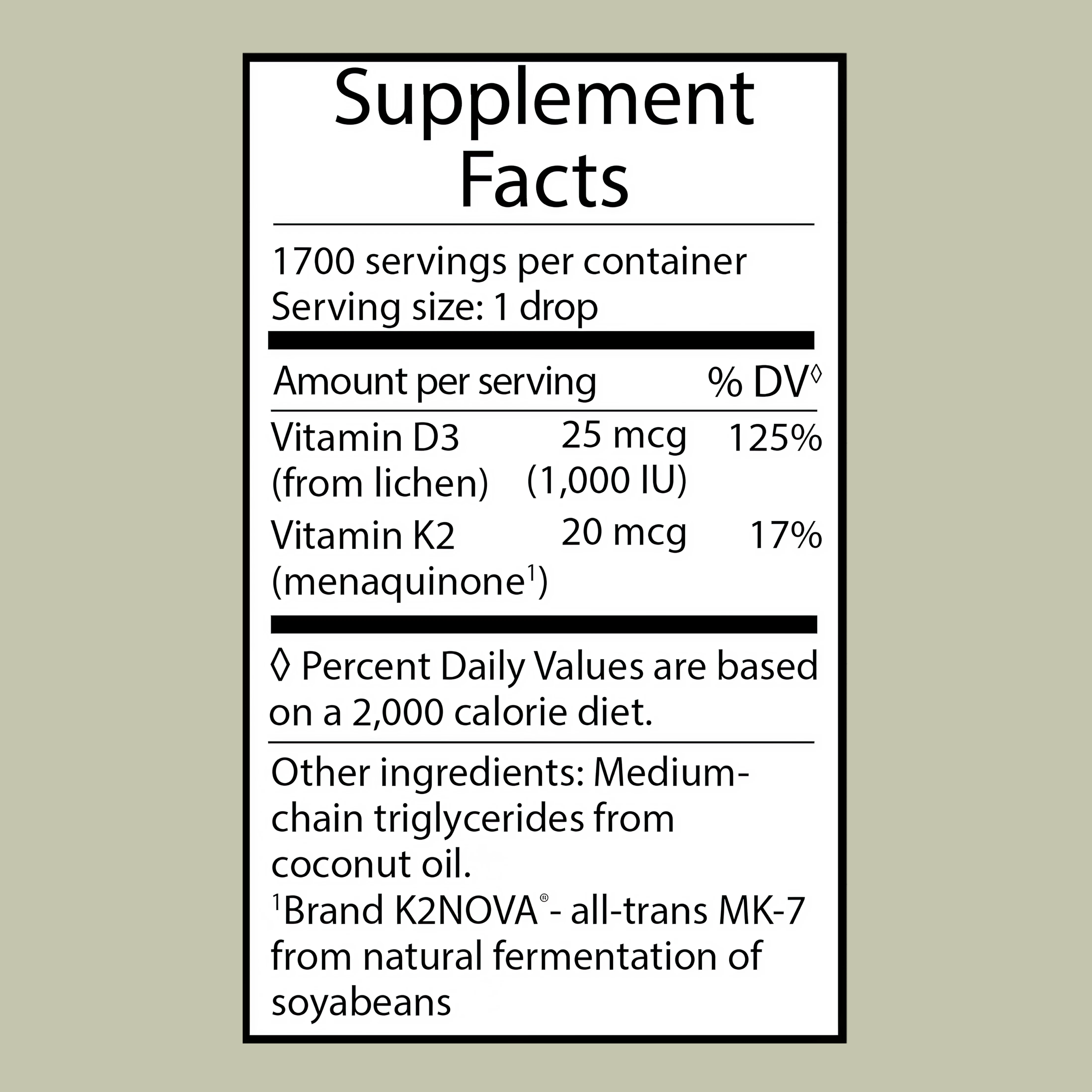| Vitamin D3 (from lichen) | 25 mcg | 1000 IU | 125% |